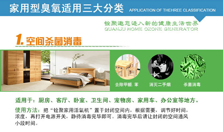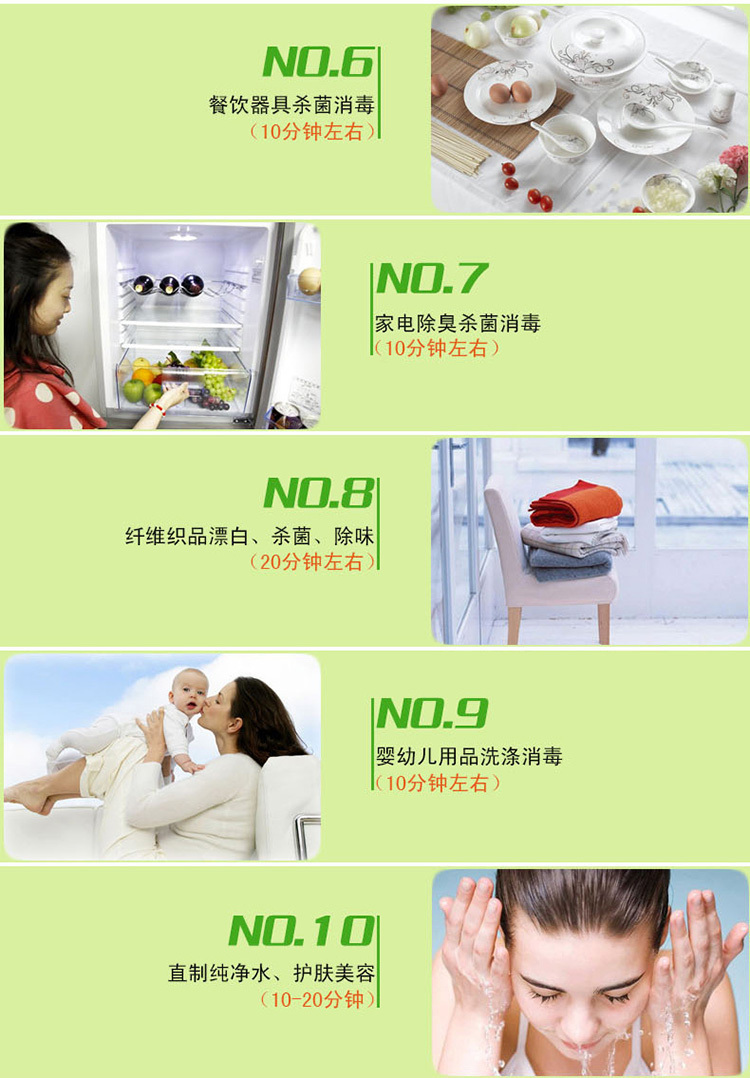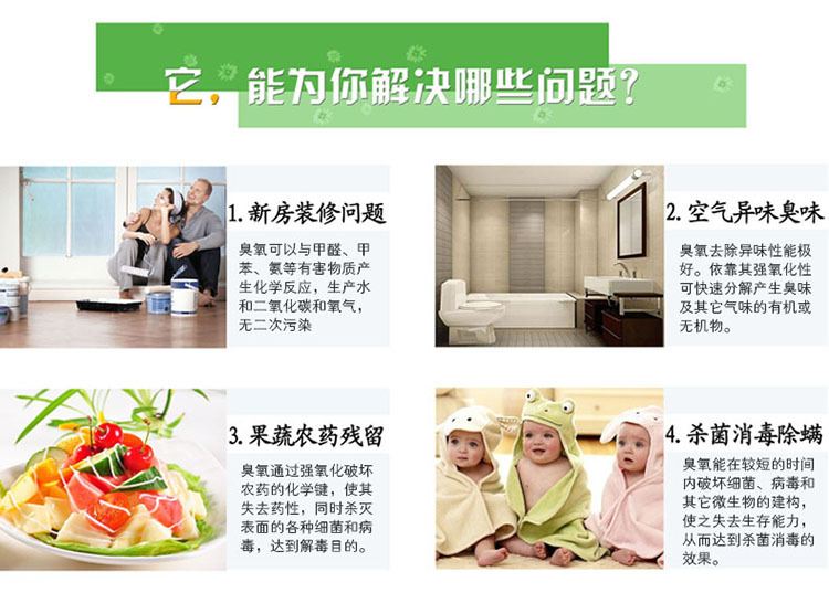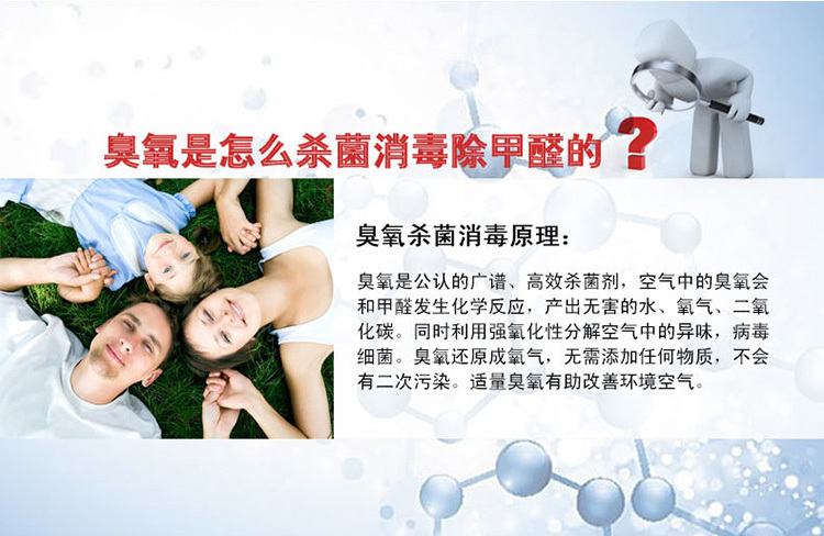 6、新居室、家具除味:裝飾材料中的化工劑會揮發(fā)出有毒氣體甲苯、甲醛,臭氧的強氧化性能在10分鐘內(nèi)消除3年才能完全揮發(fā)的有害化學(xué)物質(zhì)。讓您輕松享受 雨后森林般的清新空氣)。分解新裝修房間的甲醛,苯等有害化學(xué)物質(zhì),保證空氣清新。